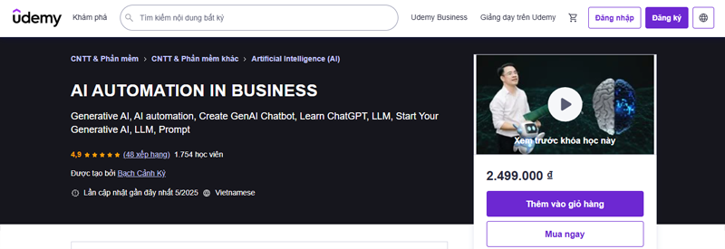 Khóa học “AI Automation in Business” trên Udemy là lựa chọn tuyệt vời cho những ai muốn ứng dụng trí tuệ nhân tạo để tối ưu quy trình làm việc. Nội dung được thiết kế khoa học, đi từ cơ bản đến nâng cao, giúp học viên hiểu rõ cách sử dụng các công cụ AI trong marketing, bán hàng, chăm sóc khách hàng và quản lý dữ liệu.