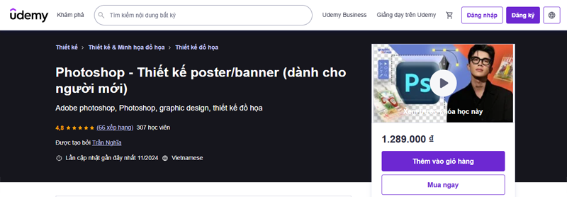 Khóa học “Photoshop – Thiết kế poster/banner (dành cho người mới)” trên Udemy là lựa chọn tuyệt vời cho những ai muốn bắt đầu làm quen với thiết kế đồ họa. Nội dung khóa học được xây dựng bài bản, hướng dẫn chi tiết từ những thao tác cơ bản đến cách tạo ra các sản phẩm thực tế như poster, banner chuyên nghiệp. Giảng viên giảng dạy dễ hiểu, kết hợp nhiều ví dụ minh họa trực quan giúp học viên nhanh chóng nắm vững công cụ Photoshop.