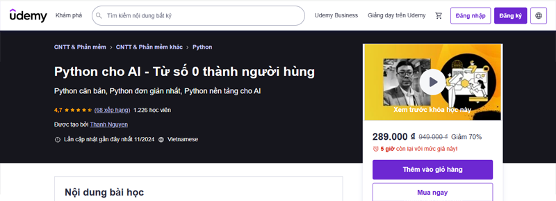 Khóa học “Python cho AI – Từ số 0 thành người hùng” trên Udemy là lựa chọn tuyệt vời cho những ai muốn bắt đầu hành trình lập trình trí tuệ nhân tạo từ con số 0. Nội dung được xây dựng khoa học, bắt đầu từ các khái niệm cơ bản về Python, sau đó nâng cao với các thư viện phổ biến như NumPy, Pandas, TensorFlow và scikit-learn.